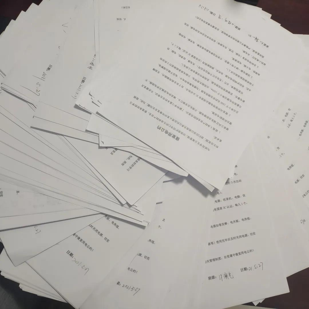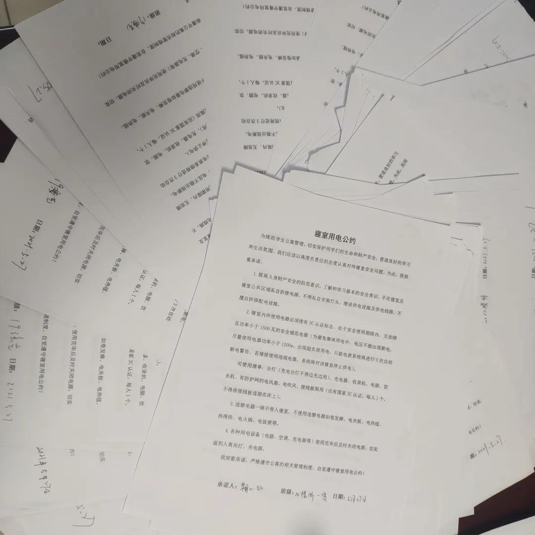 講座結束後,全體同學簽訂了寢室安全用電公約。火災遠離你我,幸福平安生活。此次講座使全體學生對消防安全知識有了更深入的了解,更加深刻地體會到消防安全的重要性,對創建“平安校園”起到了積極的助推作用。