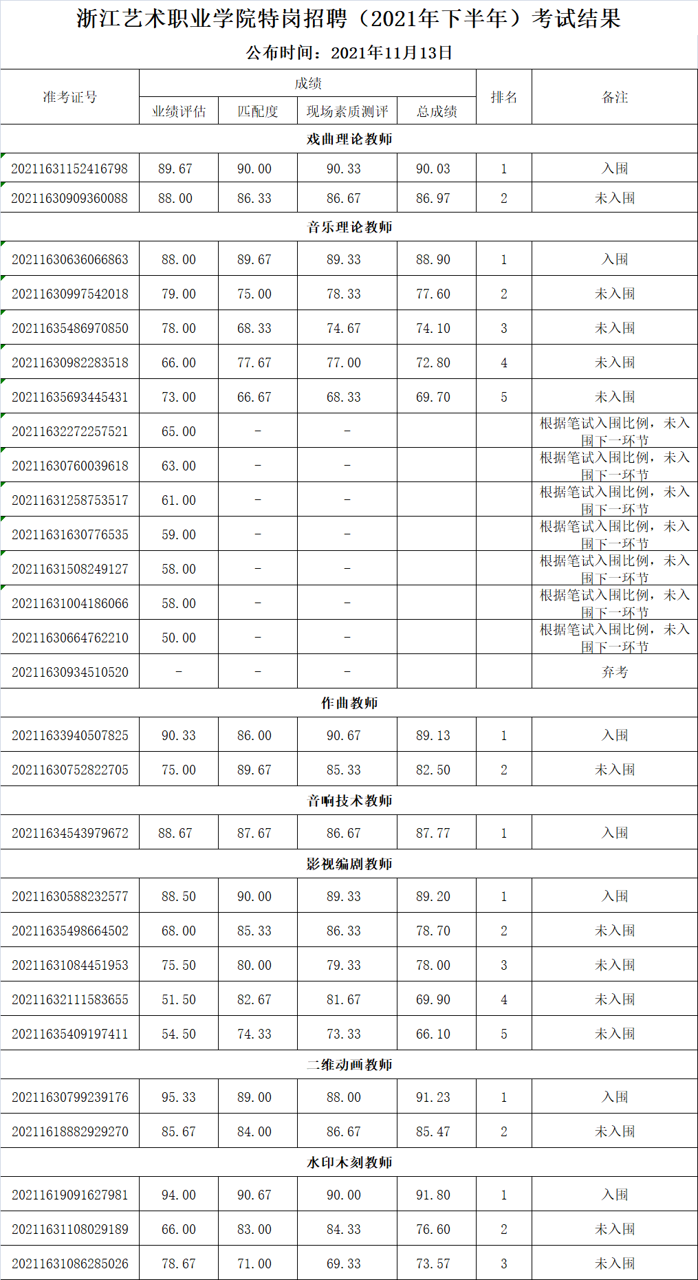 浙江藝術職業學院特崗招聘(2021年下半年)考試結果