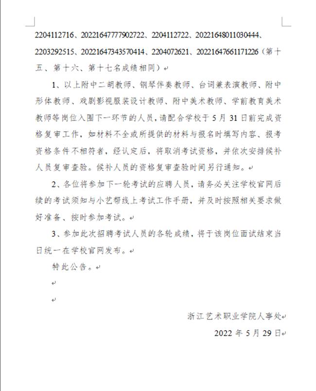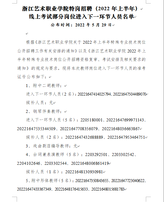 浙江藝術職業學院特崗招聘(2022年上半年) 線上考試部分崗位進入下一環節人員名單