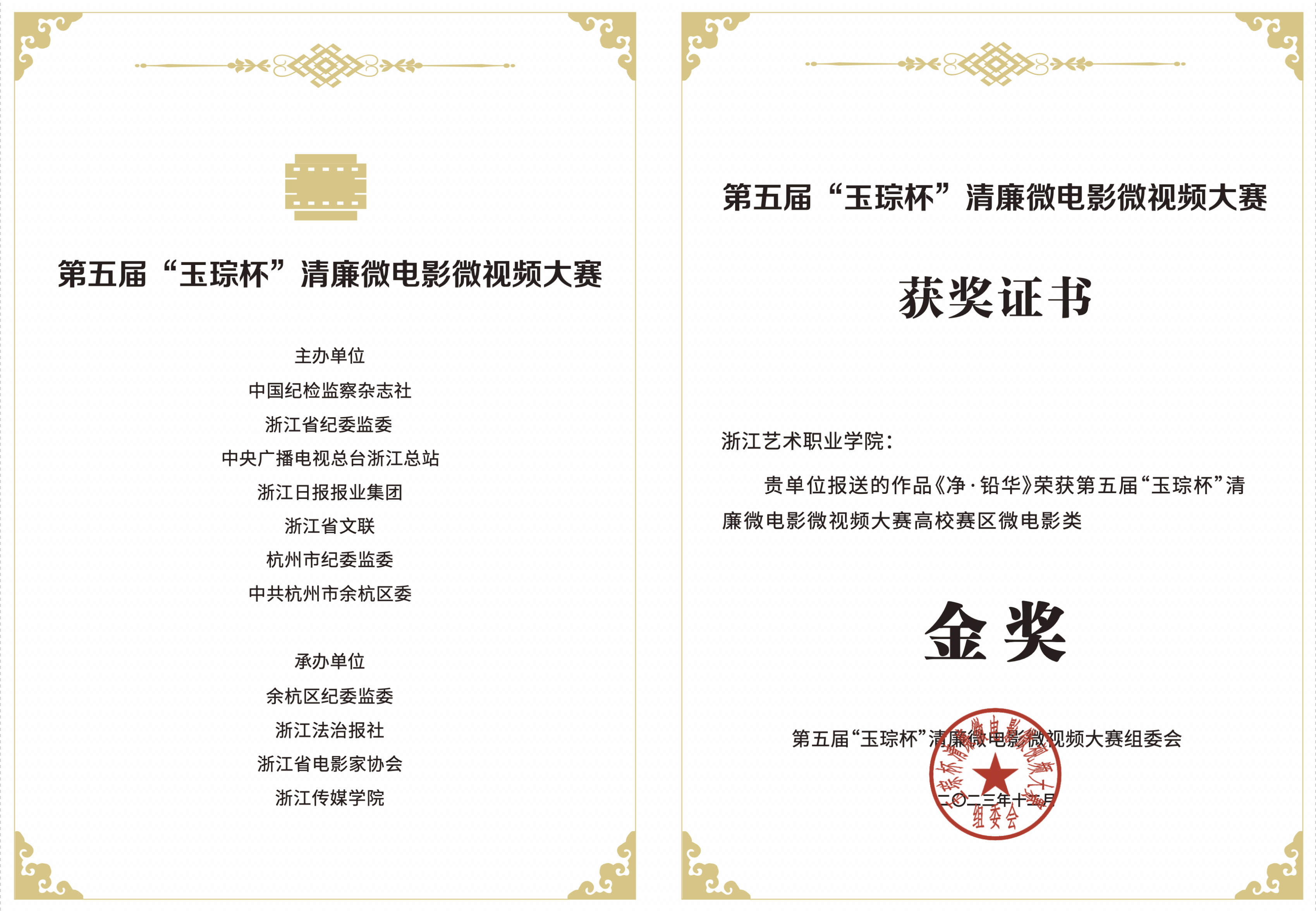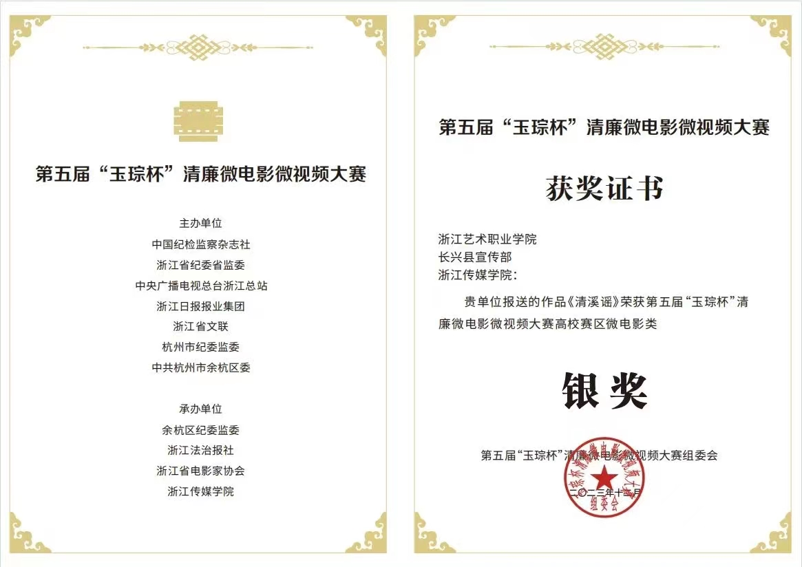 近日,第五屆“玉琮杯”清廉微電影微視頻大賽在杭州圓滿落幕,經過激烈角逐,我校參賽作品《淨·鉛華》《清溪謠》分別榮獲高校賽區微電影類金獎和銀獎。