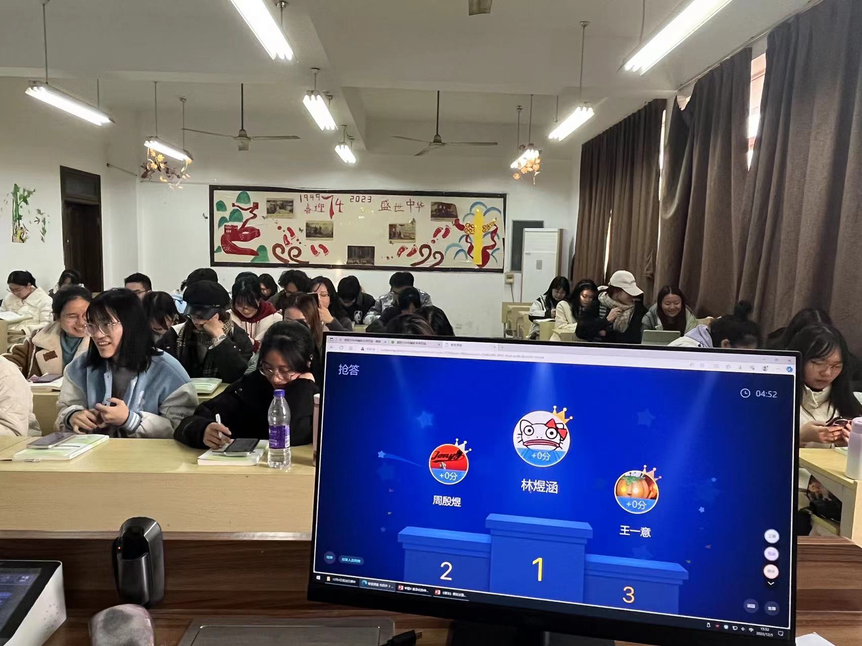 憲法知識競答活動是通過競賽的形式來激發同學們的學習興趣和參與熱情,各班教師各顯神通,采用“學習通”競答、舉手競答、起立競答等方式引導各班同學積極參與,這一環節把課堂氣氛推向了高潮。