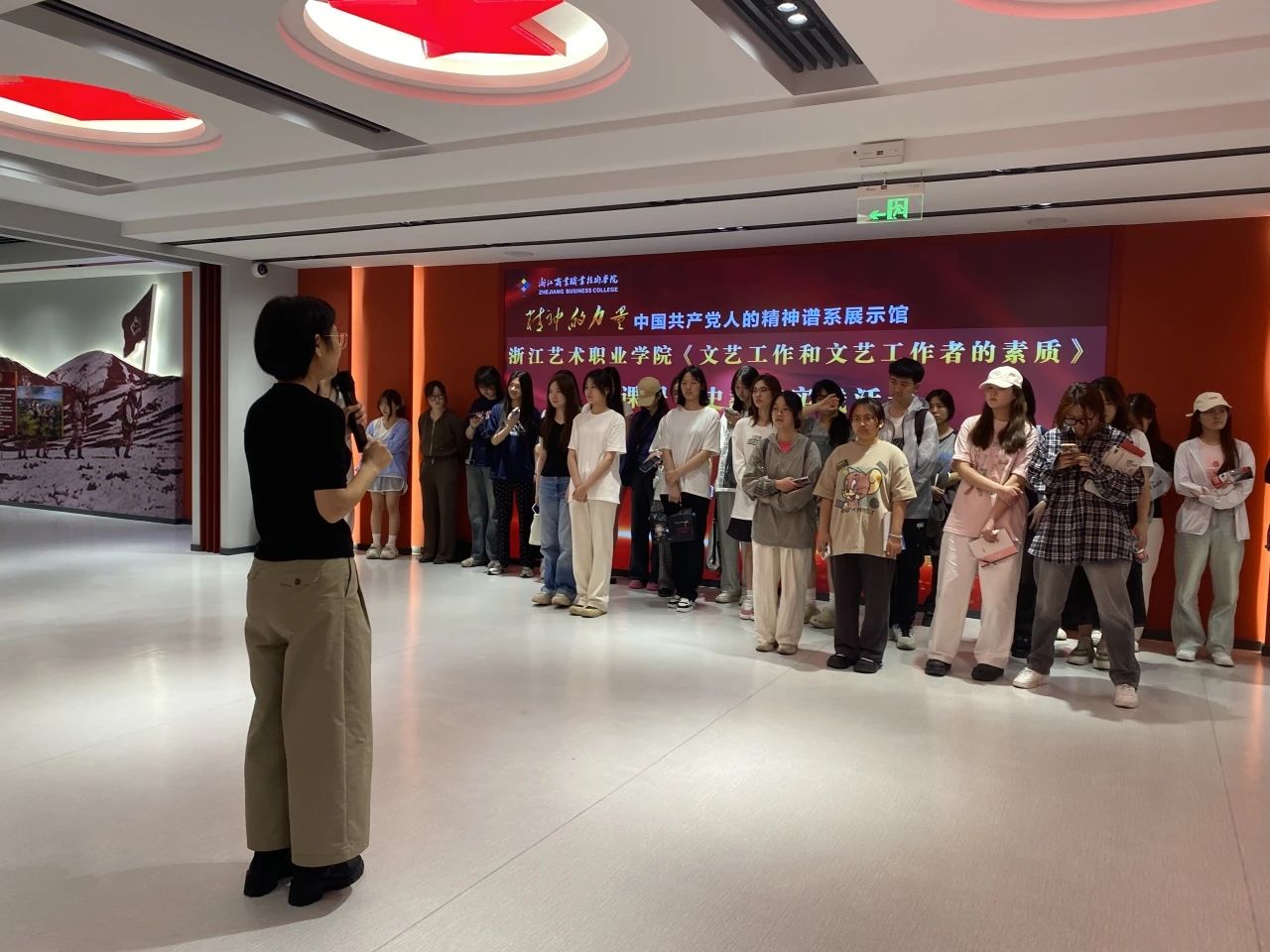 5月22日,《德藝雙馨——文藝工作和文藝工作者的素質》課堂上的30餘位同學在馬克思主義學院直屬黨支部書記、院長王筱芽的帶領下,走進浙江商業職業技術學院“精神的力量——中國共產黨人的精神譜係展示館”上了一堂黨史教育現場教學課,以紅課潤心,在紅館啟航,共話中國共產黨百年奮鬥的偉大曆程,探尋百年大黨永葆青春的精神密碼。