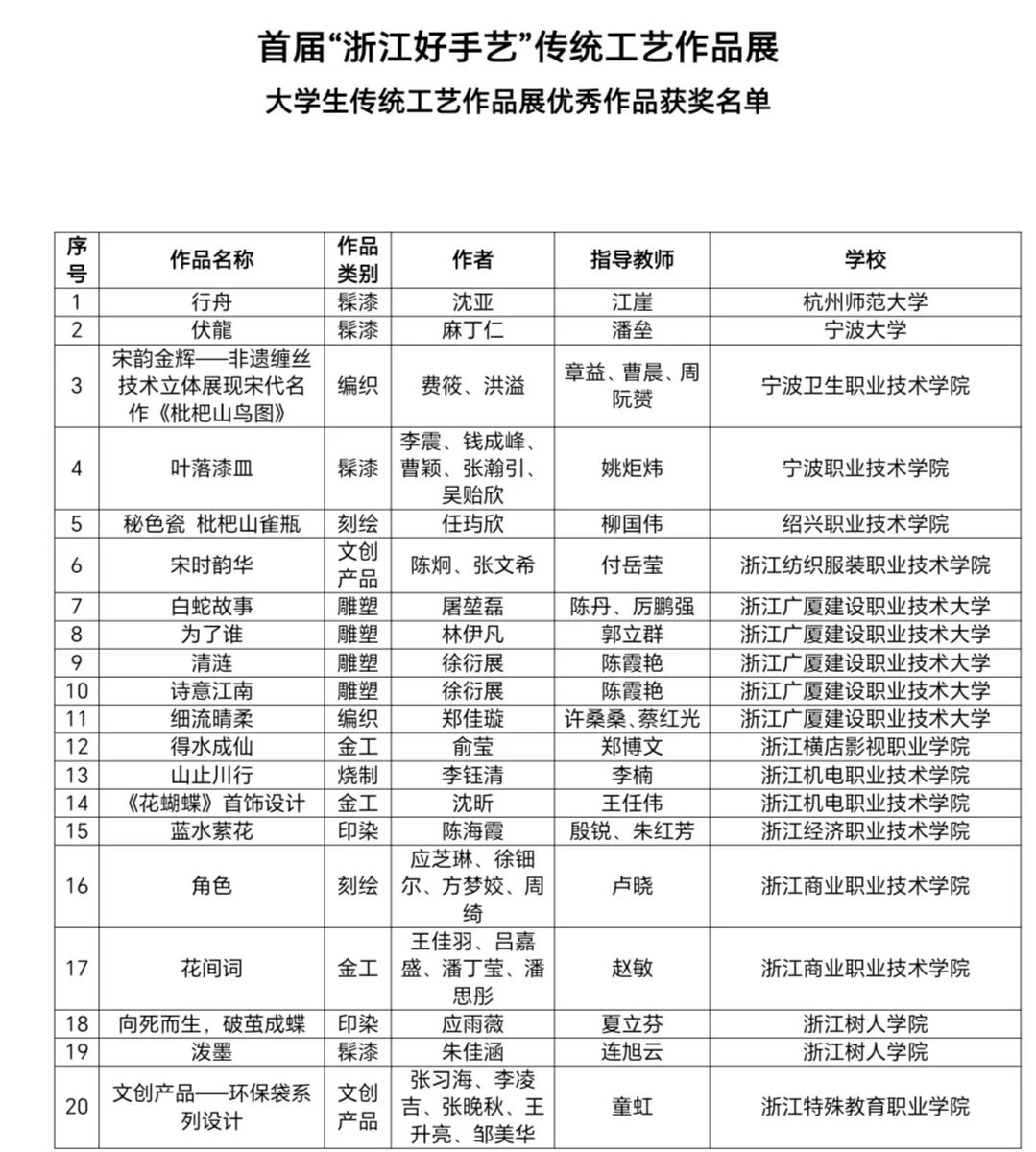 由浙江省文化和旅遊廳、浙江省教育廳指導,浙江省文化藝術類職業教育行業指導委員會、浙江藝術職業學院主辦的首屆“浙江好手藝”傳統工藝作品展——大學生傳統工藝作品展已於近日圓滿完成終評專家評鑒工作,共評選出優秀作品獎46項和優秀組織院校獎12項,現予以公布,詳細獲獎名單見附件。