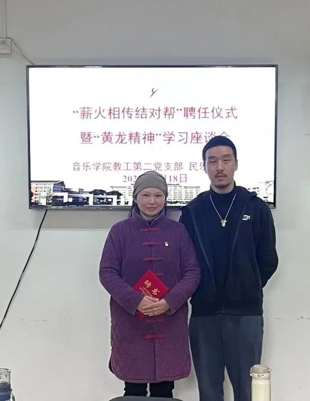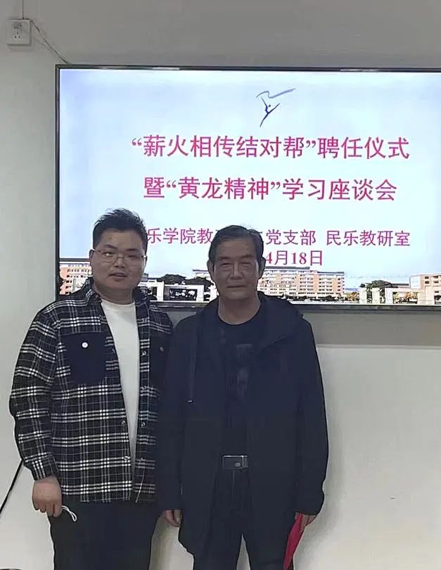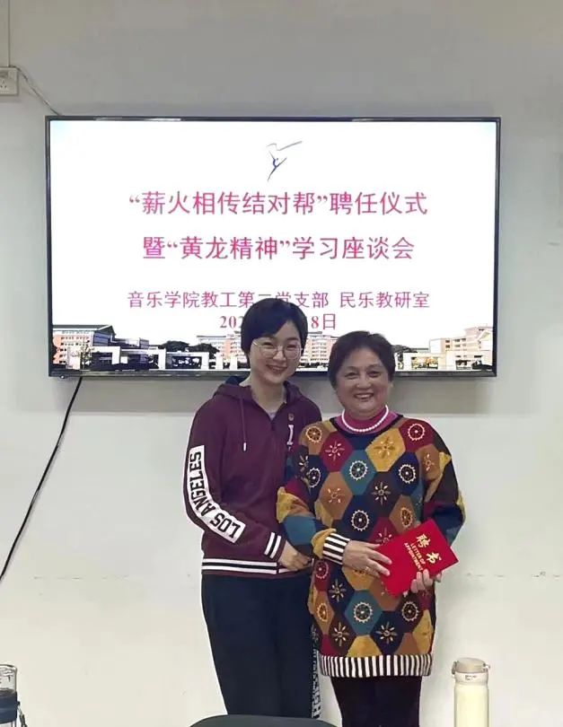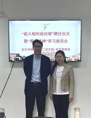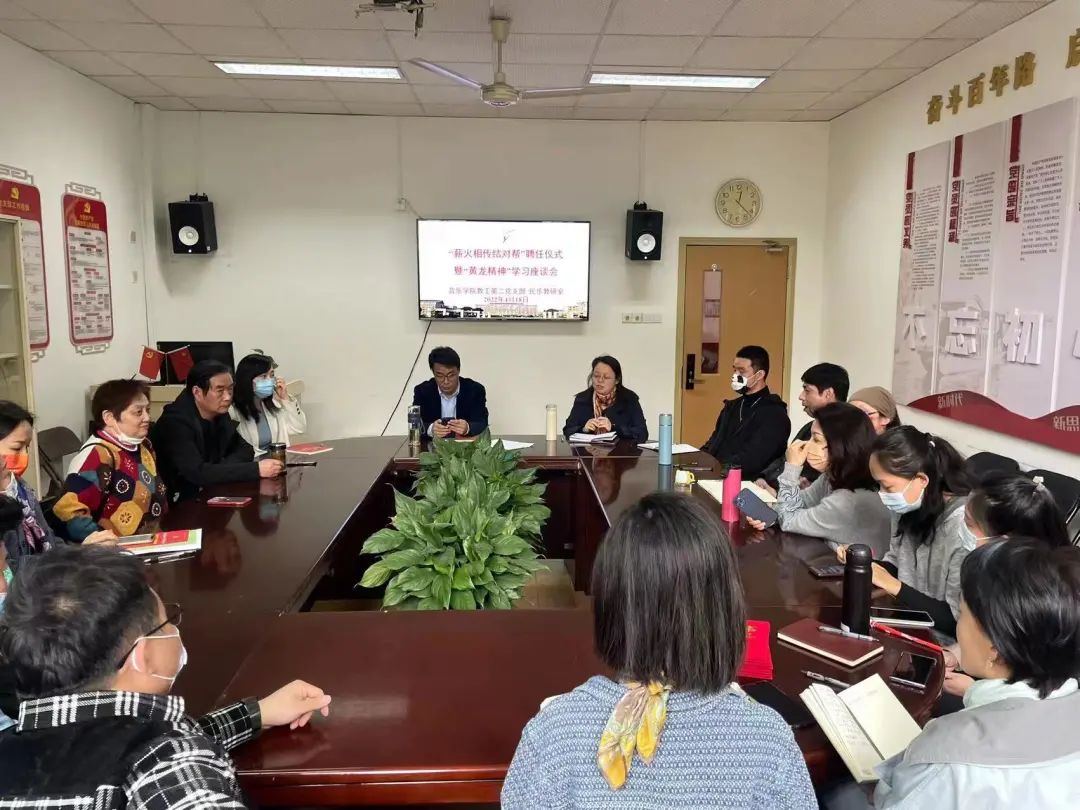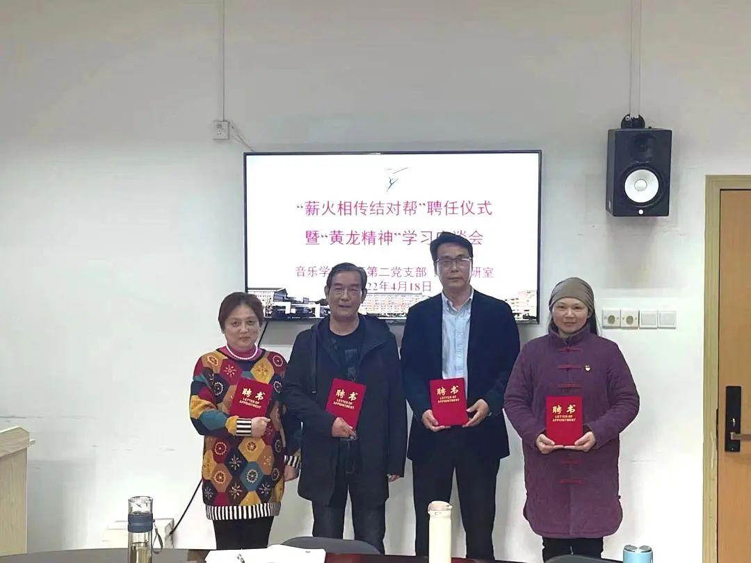 4月18日,音樂學院教工第二黨支部、民樂教研室在3101黨員之家舉行“薪火相傳結對幫”聘任儀式暨“黃龍精神”交流分享。吳樟華、朱學富、陸曙鳴、馬崊等4位正高職稱黨員教師受聘結對4名青年教師,並作“黃龍精神”與教書育人心得分享。支部黨員、民樂教研室全體教師參加。