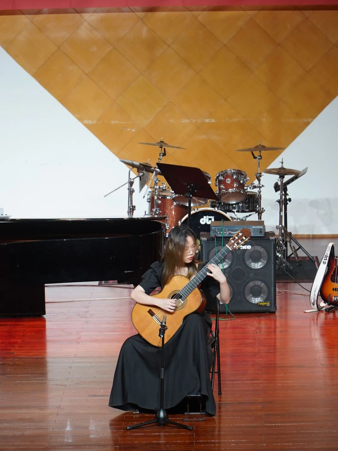 趙麗玫同學的古典吉他獨奏《山花之詩》,猶如短暫夏日的山?吹拂著盛開 的美麗花朵,指尖輕觸尼?弦時,溫柔的樂音如詩如畫。而沈靖程同學表演的小 軍鼓獨奏《Style-changing》,音符猶如曲名,?格變換多樣,明快的律動燃起了陣陣激情。