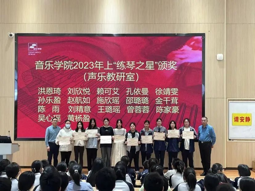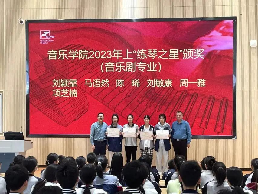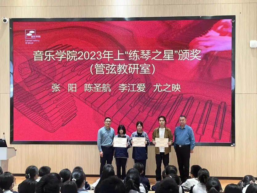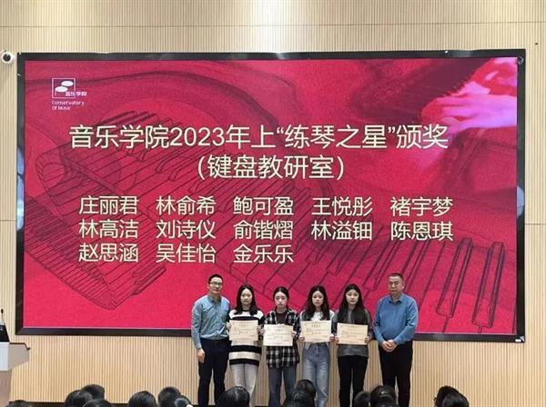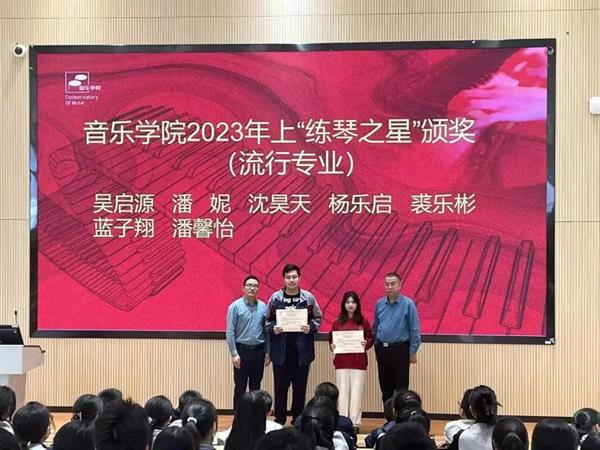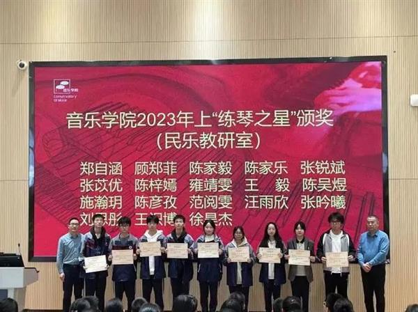 琴房是音樂學生學習知識以及提高專業水平的重要場地,音樂學院於2022年初啟動學風建設提升行動,學生的練琴積極性明顯提升,湧現了一批“練琴之星”。為表彰先進,激勵學生勤學苦練,音樂學院對各專業“練琴之星”予以獎勵。陳毅、劉夢偉為2023年上半年“練琴之星”獲得者頒獎。